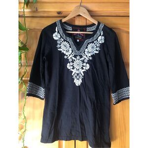 Beautiful JW Los Angeles – Joy Love Light embroidered tunic top in size Small. Black cotton fabric with intricate white floral embroidery along the neckline and sleeves. Features a V-neck, 3/4 sleeves, and relaxed tunic fit. deal for music festivals, outdoor concerts, or cultural fairs thanks to its embroidered, bohemian vibe.