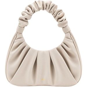 Elegant cream crossbody bag. Features a ruched handle. Perfect for any occasion.