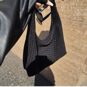This elegant black woven handbag is perfect for any occasion. Its sleek design and versatile color make it a must-have accessory.
