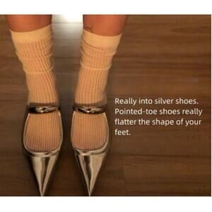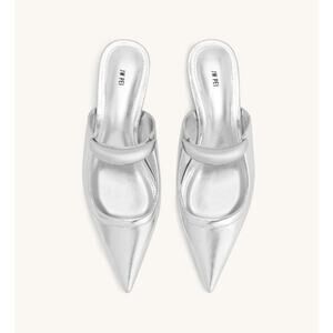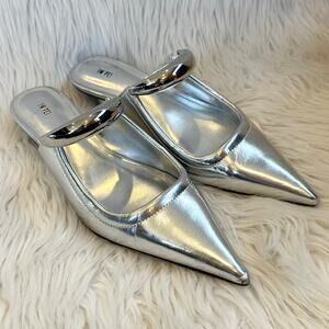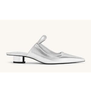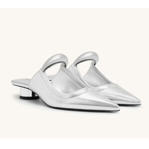 JW PEI Helena Pierced Mules Vegan Leather Slip On Pointed Toe Block Heel Shoes Color: Silver Size: US 6.5 Product Details Crafted from vegan leather, these Helena Pierced mules by JW PEI provide the perfect balance between edgy and chic. Designed with a sharp pointed toe, they feature a small block heel and shiny silver hardware. Vegan Leather Upper Vegan Leather Lining Rubber Sole Excellent Condition