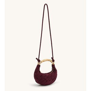 The JW Pei Orla Weave Handbag in Claret exudes sophistication with its gold handle and intricate woven design. Its compact size offers elegance and convenience, making it a versatile accessory for various occasions. The bag includes a shoulder strap and is brand new with tags, ensuring quality and style.