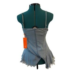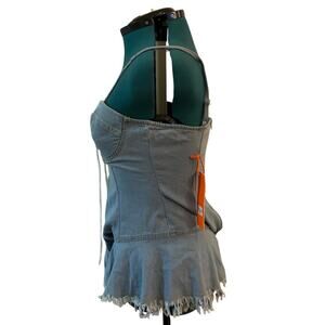 JW Signature Mini dress Denim Corset Tie Sleeveless Dress Blue Fringed Zip Back Size Large