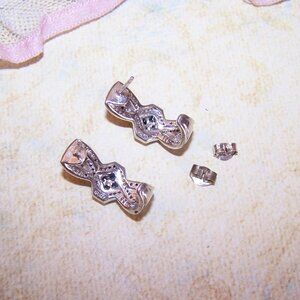 Dating anywhere from the 1990s to early 2000s, here's a pair of Sterling Silver (hallmarked JWBR STER as pictured) pierced earrings - half hoops - posts with nuts. The design to the front holds quite a number of faceted round lab created diamonds (tested) in two colors - clear and black. Because a portion of the front is colored "blue", the stones appear to have that same hue. Height is 3/4"; width across the front is 3/8". Combined weight of the pair is 4.2 grams. All the gems are melee sized so there is no grading/color BUT, because they are lab grown, perfection is assured. Very fine condition with no problems I can spot.