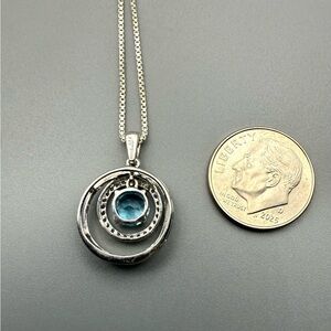 The Estate JWBR Blue and White Topaz Lab Created Gemstone are set in 925 Sterling Silver. This is a floating necklace style. The necklace is crafted from sterling silver with a metal purity of 925, making it a high-quality piece of fine jewelry.