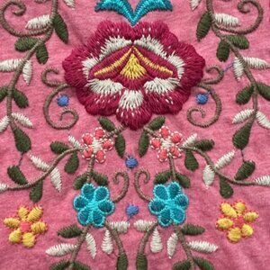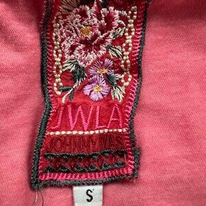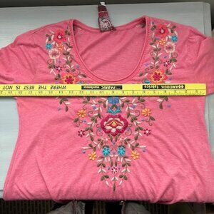 JWLA Johnny Was LA Swing Top. Bright coral with brilliant embroidery. Flattering three quarter length sleeves and scoop neck. 18" across chest. Length from shoulder to center hem is 26". Length from shoulder to side hem is 29". Excellent condition. Feel free to make an offer.