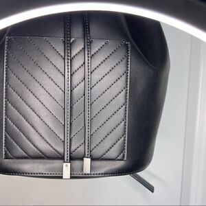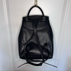 Black backpack. Vegan leather. One interior zipper pocket, one interior slit pocket. Adjustable straps, gunmetal hardware.
