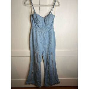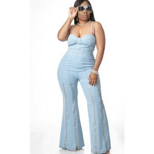 Jumpsuit with wide legs and zippers. Zippers on each leg unzips to upper thigh area, gold tone zip closure in back, spaghetti shoulder straps, 65% Algondon 35% Polyester.
