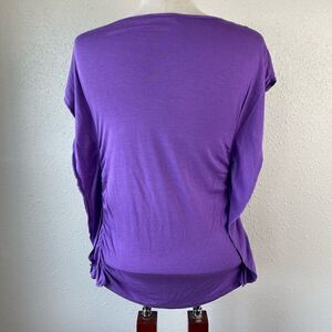 Super fun and casual purple shirt by JW Style featuring a ruffled design down the sides. It measures 18 inches armpit to armpit laying flat and is 24 inches in length from shoulder to hem.