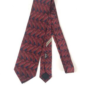 This is a unique and high-quality pre-owned necktie by J.Z. Richards (Made for Parisian). It features an eye-catching pattern that makes it a great statement piece. The pattern is a rich burgundy/red base with an intricate, repeating geometric or foulard pattern in gold, blue, and black, Brown, Tan/Beige, Olive Green, and Navy/Dark Blue accents. The tie is 100% All Silk and Handmade in America.