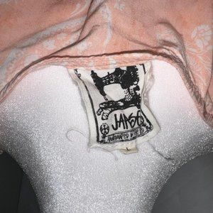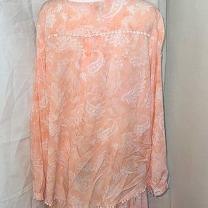 Top is size Large has a low cut in front with 3 buttons, Sleeves have wrist buttons