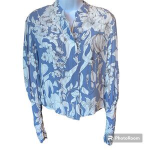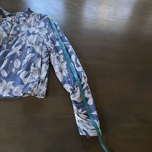 Jaase Jacket Blue White Floral Full Zip Bomber Jacket Size Large Ruched Sleeve