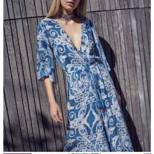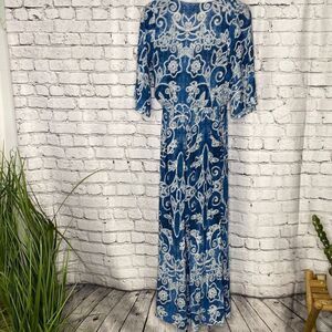Deep V neck with snap closure. ( perfect to wear w white or nude bodysuit underneath or tank top). Elastic drawstring tie waist. 3/4 length flowy sleeves. Unlined 100% rayon Australian designer