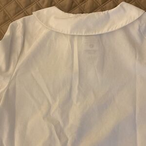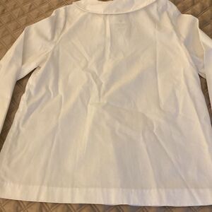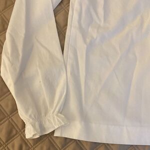 Jacadi NWOT girls white poplin long sleeve blouse with scalloped collar, 3 button front closure with surrounding ruffle, elasticized cuff with ruffle.