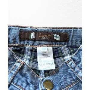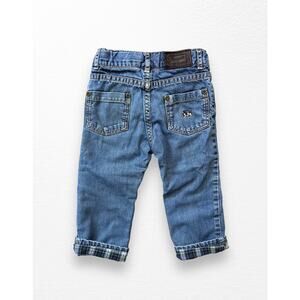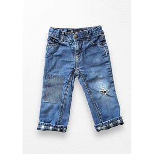 Distressed jeans from Jacadi Paris in size 18m. Inner adjustable waist, 5 pockets, lined in soft and comfortable plaid cotton, snap and zipper closure (zipper has no pull-tab, but is fully functional although not even necessary to use, IMO). 100% cotton.