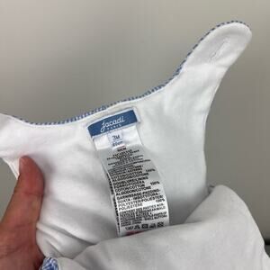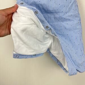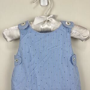 Jacadi Paris Quilted Blue Gingham Jumpsuit Overalls. Baby boy size 3 months. Sleeveless one piece romper outfit. Light blue plaid with navy dots. Buttons on the shoulders and snaps along the legs. Soft white lining. Excellent condition.