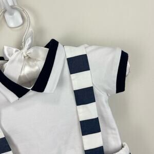 Jacadi Paris Striped Bubble Shortall Romper Set. Baby boy size 3 months. Adorable two piece outfit! Short sleeve white polo bodysuit with black stripe on the cuffs and collar. Buttons in the back and snaps at the bottom. Striped bloomers with suspender straps. Lined. Elasticized. Not sure if stripes have faded or if they're more of a dark navy and these aren't actually meant to be paired together; see close up photos for different in shade. (Still looks great and both pieces easily pair with others!)