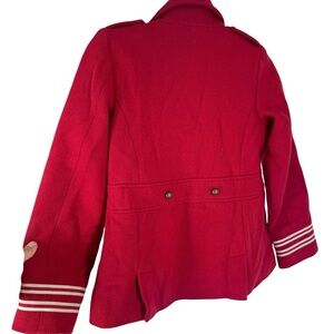 Inspired by the British 50's wardrobe with its structured cut, classic collar, modern cut-outs, flap pockets and cross-over opening. Double breasted red wool cashmere. Size 10 year. Pit to pit is 16. Total length is 21. In great preowned condition.
