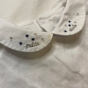 Jacadi onesie with long sleeves and cotton Peter Pan collar with silver and blue embroidery. Size 6 months but on the small side, probably fits closer to 3 months