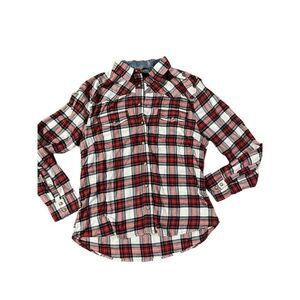 Jachs Girlfriend Bae womens maroon white plaid button down collar flannel shirt size L pearl snap