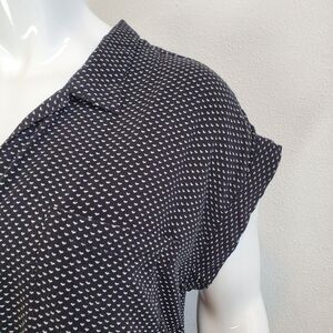 Jachs Girlfriend New York black and white heart print short-sleeve button-up shirt with notched collar, cap sleeves, and 2 chest pockets.