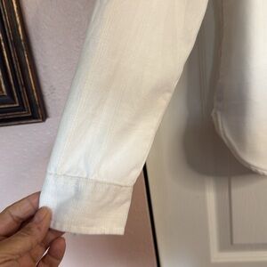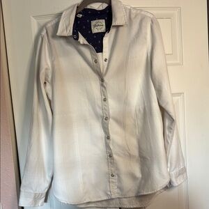 Super soft flannel with muted pattern on cream background. Pearl buttons down front and on sleeves. Slit pockets