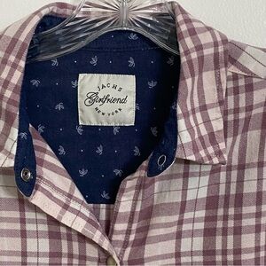Jachs Girlfriend women’s lavender and cream Pearl snap button up flannel with side pockets.