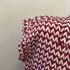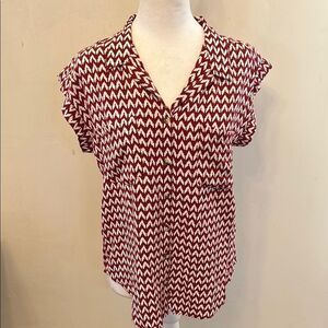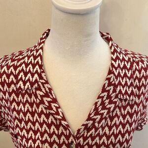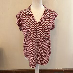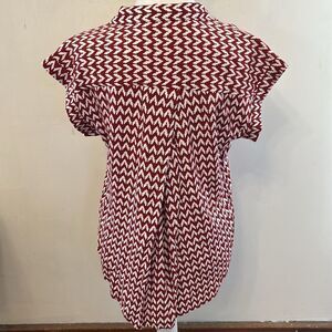 This Jachs Girlfriend top features a vibrant red and white color scheme with a notched collar and cap sleeves, offering a boxy and relaxed fit. The lightweight fabric and geometric pattern make it a stylish choice for casual outings or office wear. Size S Excellent pre owned condition