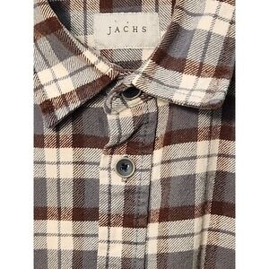 The Jachs Men's Flannel Shirt is a stylish and versatile addition to any man's wardrobe. Made from cozy cotton flannel in a classic brown and gray plaid pattern, this button-down shirt features a collared neckline and long sleeves for a classic look. With a regular fit and size large, this shirt is perfect for casual occasions and can be easily paired with jeans or chinos. The JACHS brand ensures quality and style, making this shirt a must-have for any fashion-forward man. Measurements are in the pictures. Any questions feel free to ask.