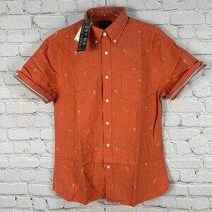 Jachs New York Men's Bar Time Short Sleeve Button Down Chambray Shirt, Size Medium, Tagged as a Red, although more like a Salmon Color, 98% Cotton/2% Spandex