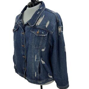 Edgy, distressed denim jacket from Jack & Avery, perfect for women who love to express their unique style. This destroyed ripped jean jacket is a 3X size, ensuring a loose and comfortable fit.