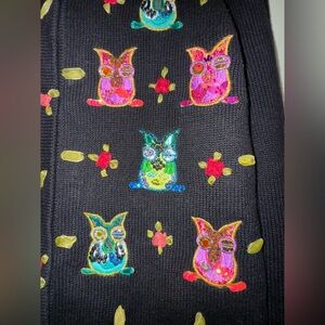 Charming black cardigan featuring vibrant owl embroidered, sequined in pink, green, and blue. Perfect for adding a playful touch to your outfit.