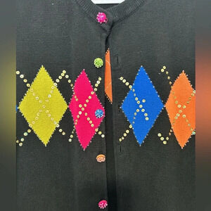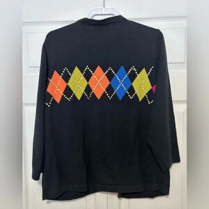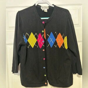 Jack B. Quick Cardigan Sweater Plus Size 2XL Black Sequins Stretchy Lightweight. Preloved good condition add great pop of color to your wardrobe. See pics for missing sequins on diamond but doesn’t take away from overall look of sweater.