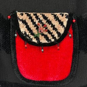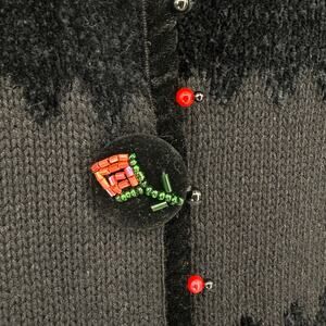 Beautifully detailed button front sweater featuring intricate beadwork and floral embellishments on the collar, cuffs, and pockets. Classic design in black, red, and tan tones — perfect for vintage and statement wear lovers.