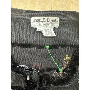 The Jack B. Quick Women's 2XL Ugly Christmas Holiday Cardigan Sweater is a festive and fun addition to your winter and fall wardrobe. Made from a warm knit fabric, this black sweater features a round neckline and long sleeves, perfect for the holiday season. The sweater is adorned with vibrant accents like jewel, button, beaded, rhinestone, and embroidered Santa Claus and reindeer designs, adding a touch of whimsy to your outfit. It is a classic plus size fit that is both breathable and easy to care for with machine washable instructions. Perfect for casual, holiday, or formal occasions, this cardigan is sure to spread Christmas cheer. See pictures. There are some missing lights on the “buttons”. Small mark on cuff.