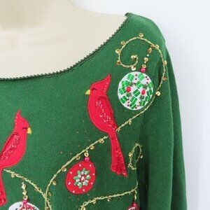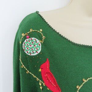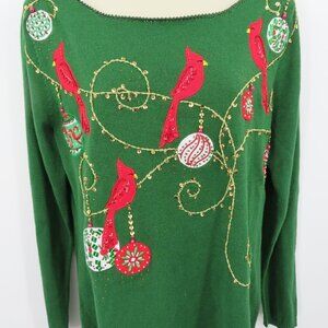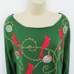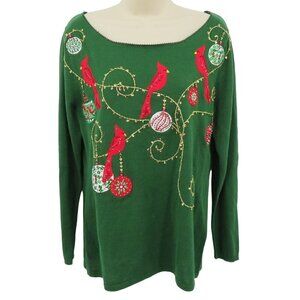 Jack B Quick Women Medium Green Cardinal Ornament Beaded Embroidered Shirt Top