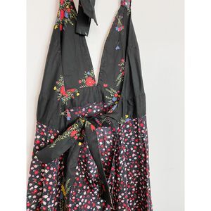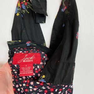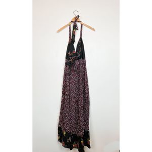 Breezy mixed floral print halter maxi dress by Jack by BB Dakota. Deep v bust in black/colorful bouquet print paired with vibrant all over ditzy floral printed skirt. Back zip, open back halter with ties at bust and neck. Perfect summer vibes.