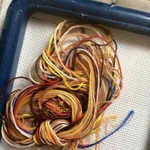 The finished product will measure approximately 5 inches wide by 7 inches tall and fits in the included frame. The kit is sealed in its original package. It includes 14 count Aida cloth, embroidery floss, hoop frame, needle, chart, and directions.