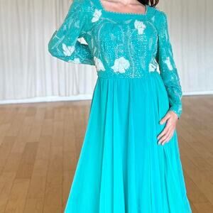 Stunning vintage Jack Bryan Vintage turquoise chiffon dress with hand-sewn sequin floral embellishments. Features a fitted bodice with sheer long sleeves, a square neckline, and a full flowing skirt that moves beautifully. Perfect for formal events or as a one-of-a-kind statement piece.