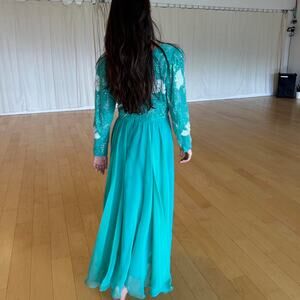 vintage gown turquoise eveningwear sequin floral sheer sleeve square neckline flowing skirt cocktail retro elegant