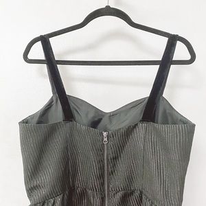 Jack mini dress. Style is called Phoebe. Fit & Flare silhouette. Black in color with fun black velvet straps. Discrete pinstripes that are silver shimmery metallic sparkle in different lighting. V sweetheart neck line with built-in side supports for a better fit. Exposed zipper up back. Lined. Size LARGE