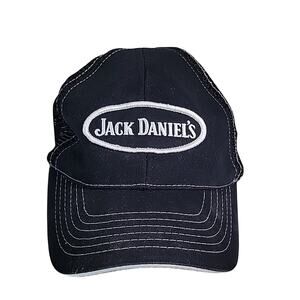 Stylish black trucker hat with Jack Daniel's logo. Features white stitching and mesh back.