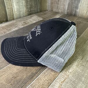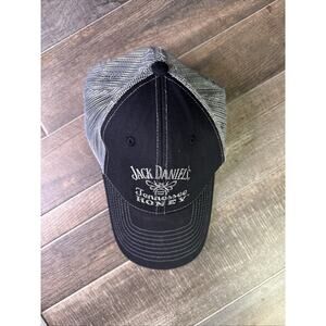 The product is a Jack Daniel's Tennessee Honey Hat in black and gray, featuring a snapback trucker cap design with a mesh back. It is branded with Jack Daniels and has a theme related to the distillery. It is an original piece of merchandise.