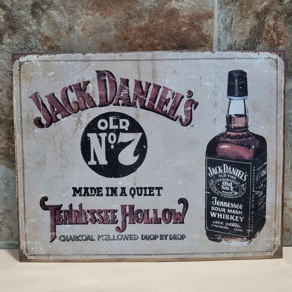 A Jack Daniel's sign with a bottle of Jack Daniel's Old No. 7 Tennessee Sour Mash Whiskey. The sign has the Jack Daniel's logo, the words "Made in a Quiet Tennessee Hollow," and "Charcoal Mellowed Drop by Drop". The bottle label also includes "Tennessee Sour Mash Whiskey" and "Lynchburg, Tenn."