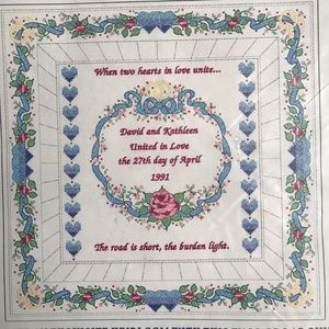 This is a never used Jack Dempsey Wall Quilt Kit Wedding Embroidery "When 2 Hearts in Love Unite!"
