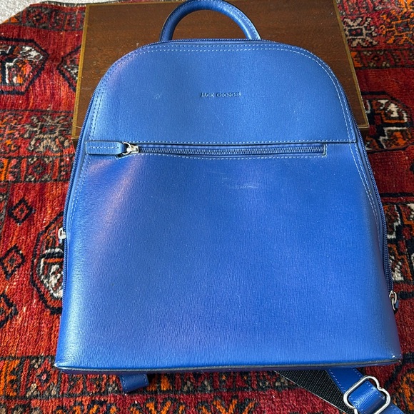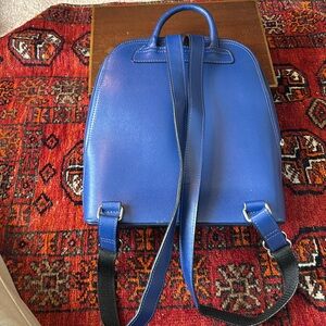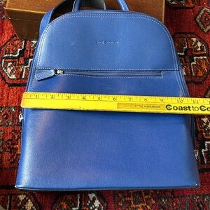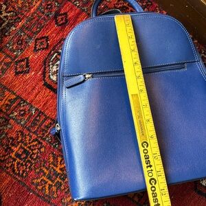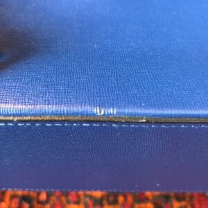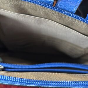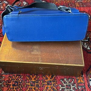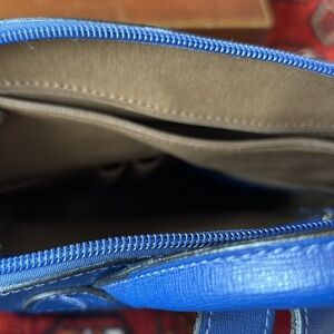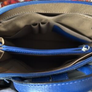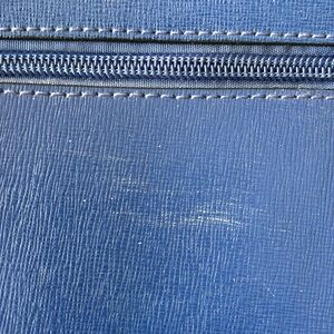 Blue epi leather. Structured with many compartments inside—credit cards, pens, phone, etc.