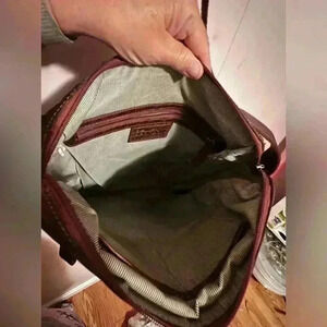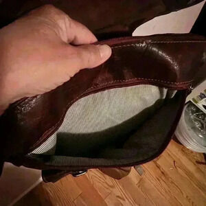 Slight leather separation on one strap, does not effect strap, as it is lined with brown nylon webbing on the back.