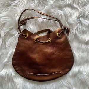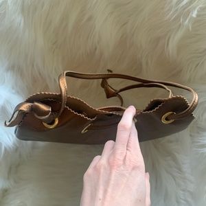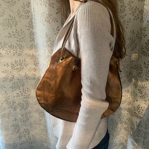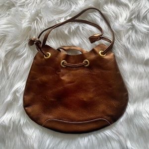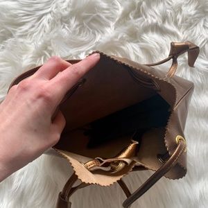 Metallic leather bronze/gold with suede interior. Great condition 12 x 10 x 0.5”