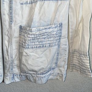 Gorgeous fun Jack Anthropologie BB Dakota cargo trenchcoat long, oversize baggy, white washed distressed denim jean jacket with a drawstring waist, full zip.