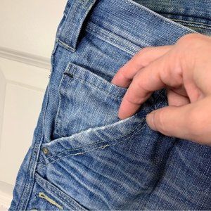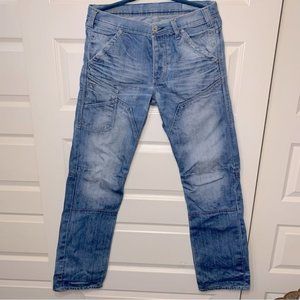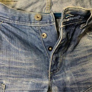 In great distressed condition. Well made and good thick denim material. Retro streetwear jeans, med wash. Button fly. Slash pockets, double leg pockets and 2 buttoned pocket in the back. Got some distressing and wears; Tiny sport in the inseam, trim of slash pockets, on the hems and a discoloration on the waist from the leather patches. No size tag, please see measurements and pictures.