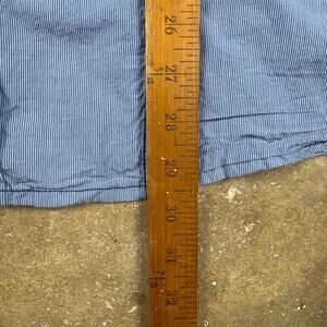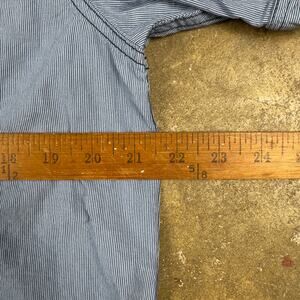 The blue pinstripe cotton blend fabric has a rugged yet lightweight feel, making it an easy everyday piece. Shirt is in excellent pre-owned condition with no major flaws.